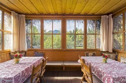 Unser lichtdurchflutetes Verandazimmer mit prächtigem Blick in unseren Garten ist der ideale Platz zum gemütlichen Beisammensein und ein beliebter Aufenthaltsraum für Familien oder Gruppen.